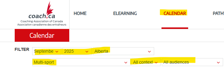 A bit harder to navigate, but the CAC Calendar will sometimes show courses in other provinces. Not all provincially hosted courses show up here, however, so you can reach out to provincial sporting bodies similar to AB Sport to see if they are hosting anything. Make sure the filters are set correctly. Choose a month, a province, and select 'multi-sport'.