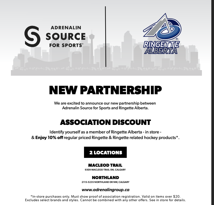 Beyond sponsorship, Adrenalin Source for Sports is investing directly into our ringette community through an annual contribution to the Ringette Alberta Scholarship, helping support young athletes both on and off the ice. They are also offering exclusive association discounts for all Ringette Alberta members, making quality equipment more accessible across the province. This partnership strengthens our athlete pathway, elevates our provincial championships, and continues building the community spirit that defines our sport.